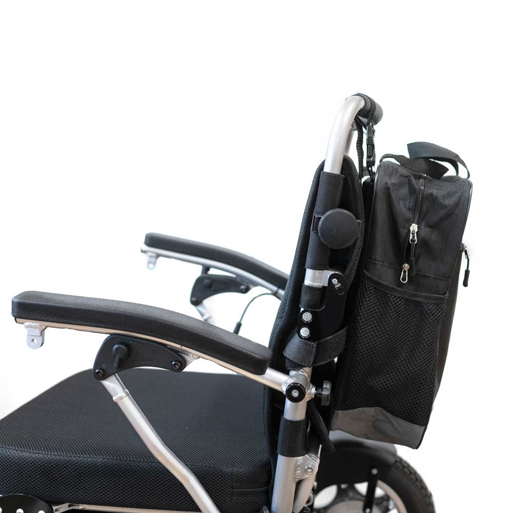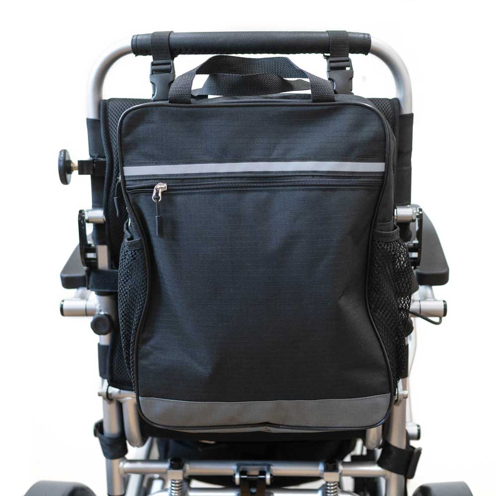 Ervaar de perfecte combinatie van ruimte en duurzaamheid met onze rugleuningtas, die perfect past bij alle Eloflex-modellen. Deze veelzijdige tas wordt met riemen om de rugleuning van de elektrische rolstoel bevestigd en vervolgens moeiteloos verwijderd of weer bevestigd met snelsluitingen en VELCRO®-banden. Naast het grote hoofdvak heeft de tas een ruim voorvak en handige zijvakken van gaas, zodat u veel opbergmogelijkheden hebt voor uw spullen. De rugleuningtas is uitgerust met reflecterende tape voor meer veiligheid. Hij heeft een inhoud van 16 liter en is 39 cm hoog, 37 cm breed en 12 cm diep.
