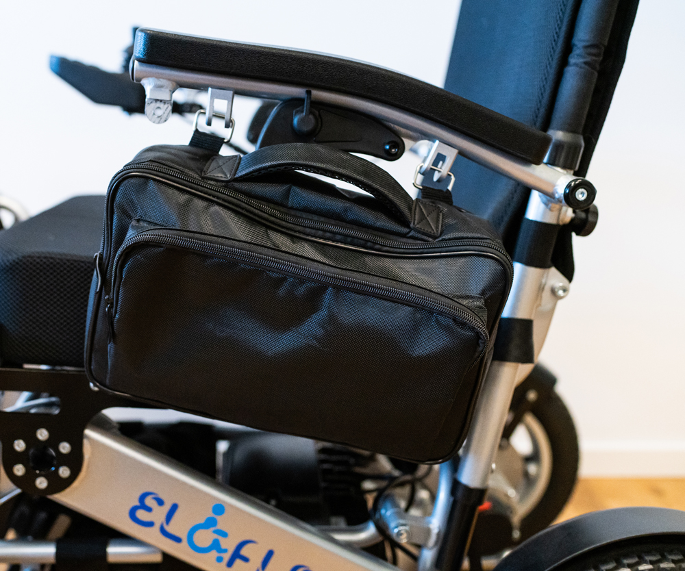 Avec le sac latéral Eloflex, vous pouvez facilement ranger des objets comme votre portefeuille, votre téléphone et d’autres objets de valeur pour un accès facile. Le sac est fixé à l’aide de crochets qui se vissent sous l’accoudoir. Pour accéder à vos effets, décrochez simplement le sac de l’intérieur de l’accoudoir, ce qui facilite l’accès facile sans risque d’être volé.