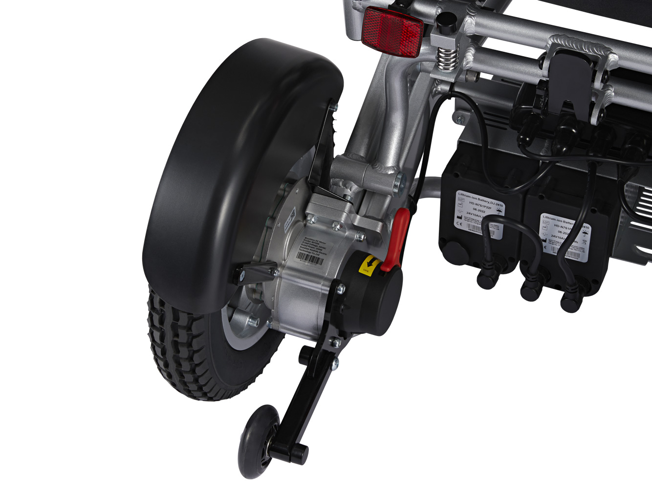 Une attention particulière a été portée à l’ergonomie et à la convivialité. Le support du joystick intelligent se replie, vous permettant de vous rapprocher du bord de la table, et le repose-pieds se range soigneusement lorsque vous êtes assis ou debout. Les grandes roues arrière gonflées à l’air et les amortisseurs à ressort de l’essieu avant absorbent parfaitement les chocs, même sur des surfaces irrégulières.