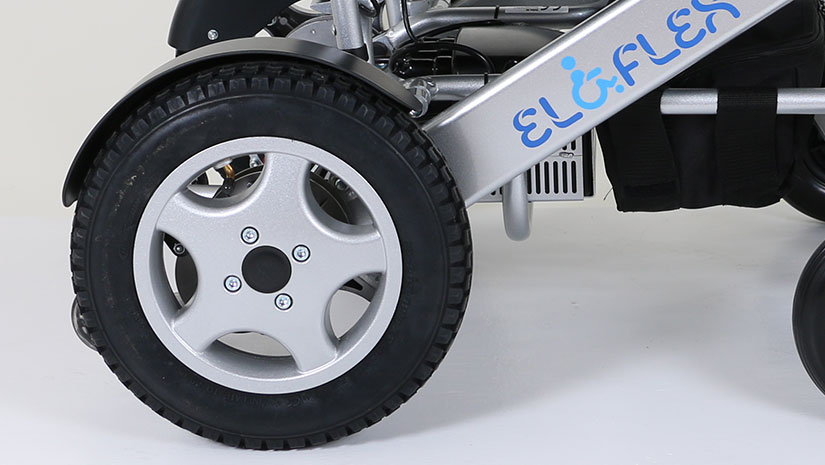 Er is veel aandacht besteed aan ergonomie en gebruiksvriendelijkheid. De slimme joystickbevestiging kan worden neergeklapt, zodat dichter bij de rand van de tafel kunt komen. De voetsteun kan netjes worden weggeklapt als u zit of gaat staan. Grote achterwielen met luchtbanden en verende voorvork zorgen voor een goede schokdemping op slechte wegen en paden.